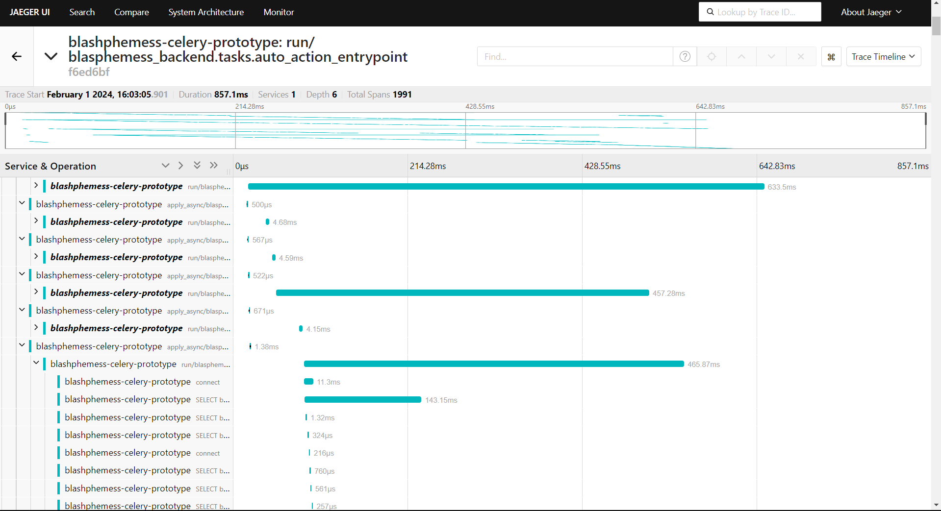 Jaeger gives me insight into the trace timeline of both Celery tasks and HTTP requests that my FastAPI backend receives. It also connects up to my database to show what operations are going on!